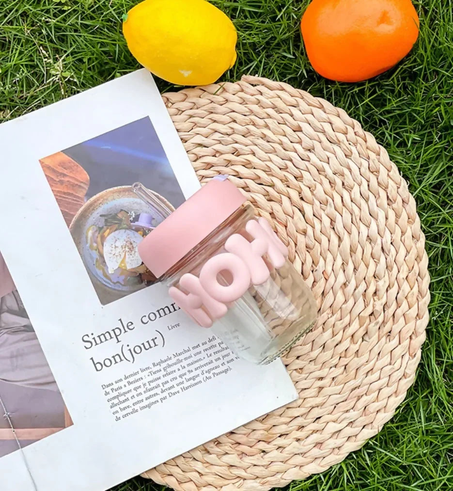 cute glass cup, hoho milk jar, mason jar tumbler, pastel smoothie cup, reusable straw jar, kids milk cup, iced coffee mug, aesthetic drinkware, leakproof glass tumbler, eco friendly cup, mini juice bottle, home decor kitchen accessories, borosilicate glass mug, travel tumbler pink